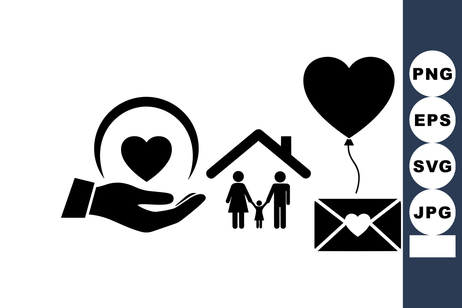 Black silhouette icons depict hands protecting heart, family under house roof, heart shaped balloon, and love letter envelope in a minimalist vector style promoting love and care.