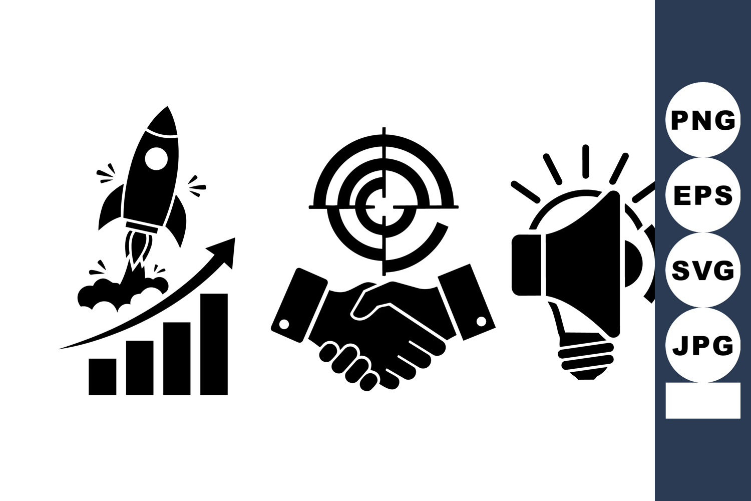 Business Icon Set Communication Icon Set Rocket Launch Vector Growth Arrow Graphic Marketing Symbol Pack Handshake Partnership Icon Strategy Planning Bundle Success Achievement Graphic Target Goal Illustration Idea Lightbulb Clipart