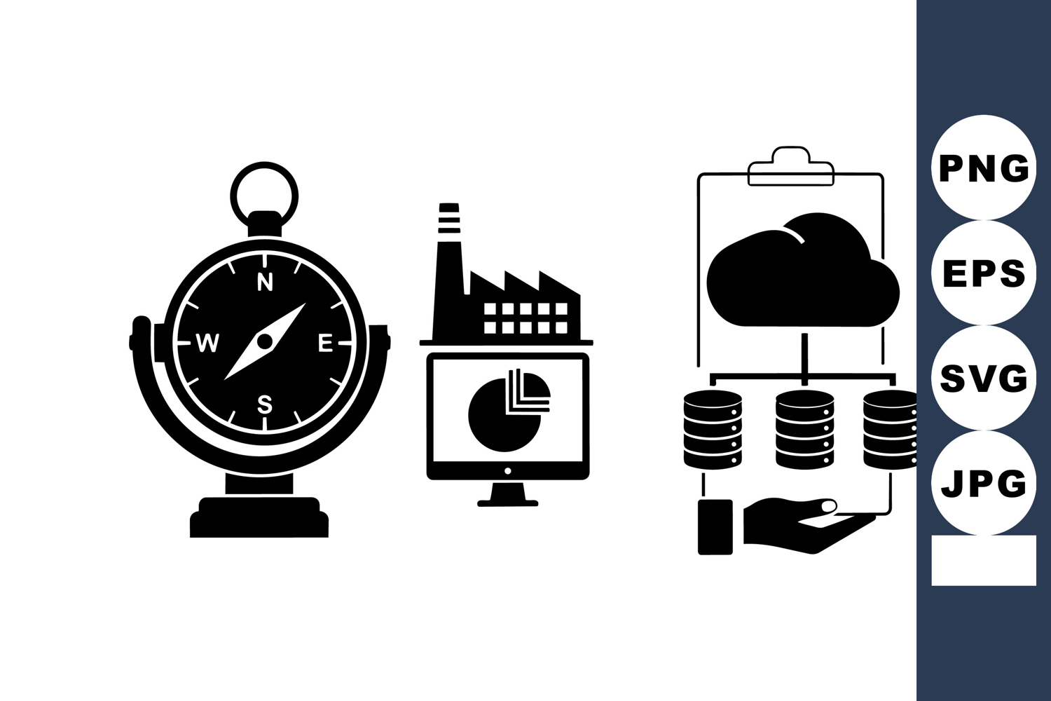 Simple black and white vector icons depicting a compass, industrial factory with computer charts, and cloud data storage network on clipboard.