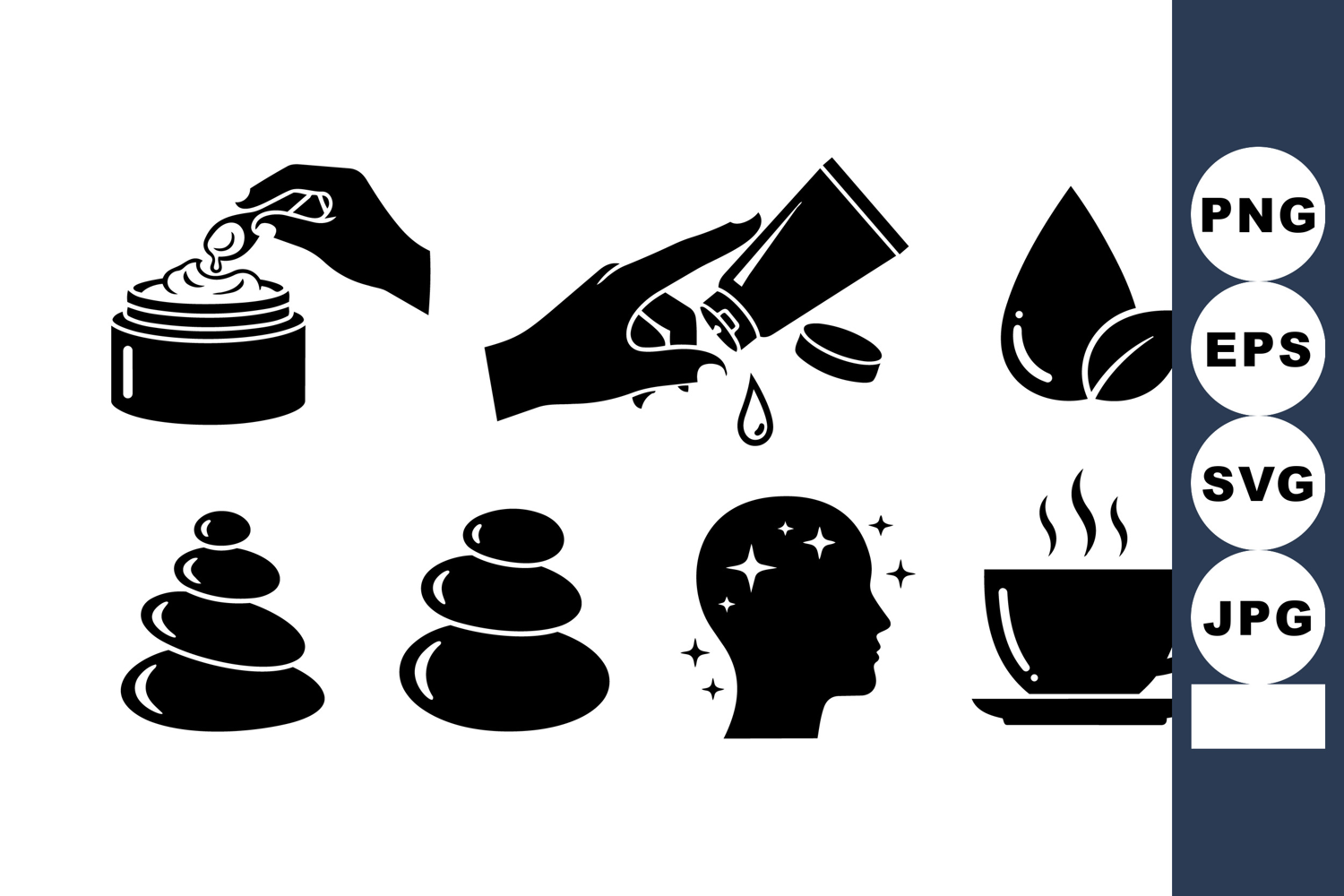 Set of black spa and wellness icons showing hands with cream and oil, stacked relaxation stones, sparkling head, and steaming cup in clean minimal vector style.