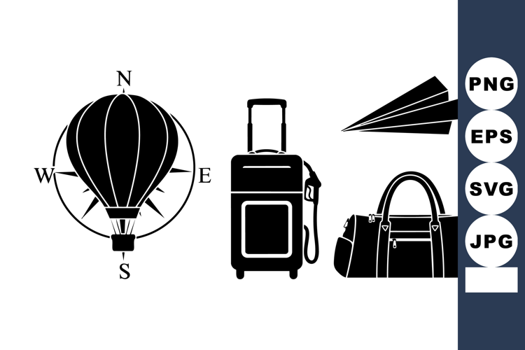 Set of black silhouette icons including a compass hot air balloon, rolling suitcase, duffel bag, and paper airplane in flat design style with clear shapes