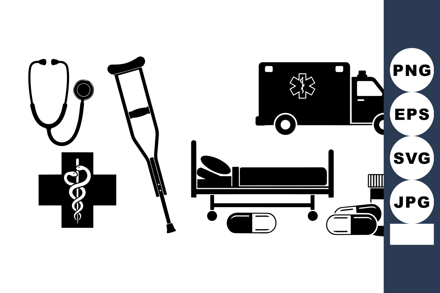 Black silhouette medical icons collection featuring ambulance, hospital bed, crutch, stethoscope, pills, and prescription bottle in flat vector style for healthcare themes.