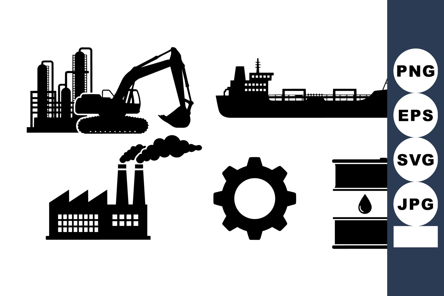 Collection of industrial silhouettes including factory emitting smoke, excavator, cargo ship, gear, and oil barrels, depicting heavy industry and transport themes