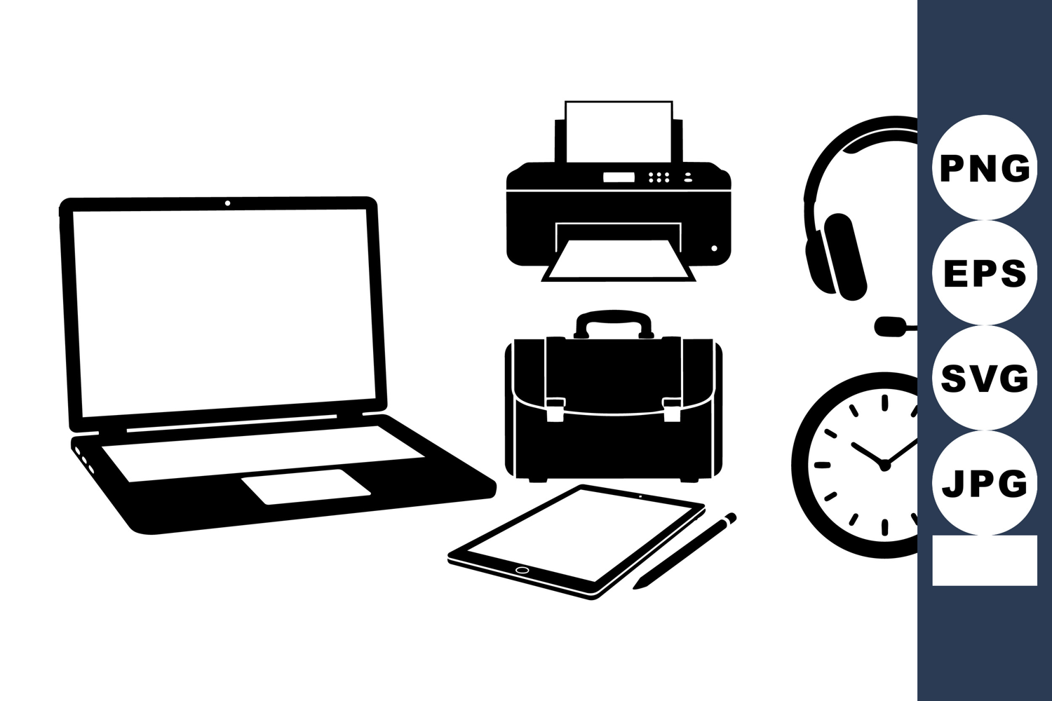 Collection of black and white flat icons including open laptop, printer, headset, briefcase, clock, and notebook with pen for business and office design projects.