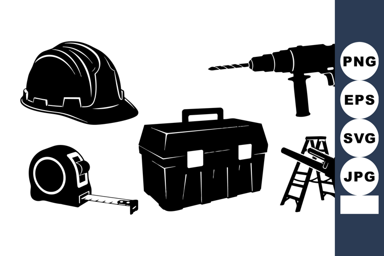 Construction Tool Set Vector Tool Clipart Hardhat Safety Gear Power Drill Vector Toolbox Clipart Pack Measuring Tape Design Ladder Silhouette Art Diy Repair Tools Industrial Work Kit Worker Helmet Icon