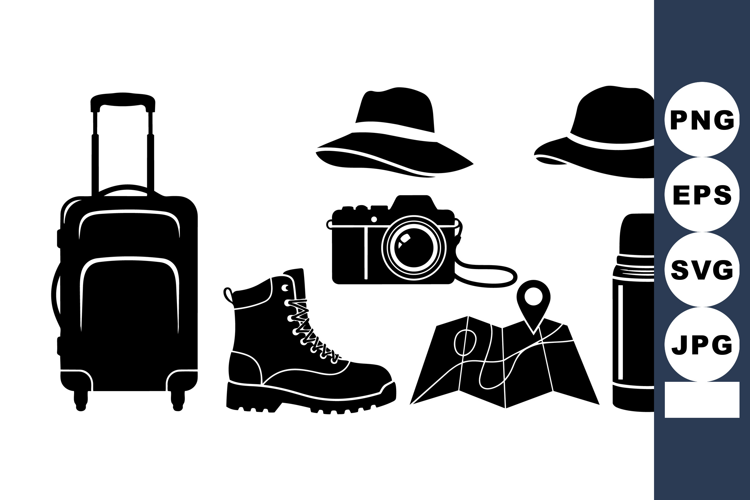 Set of black silhouette travel themed flat icons depicting essential items like suitcase, camera, hiking boot, hats, map, and thermos