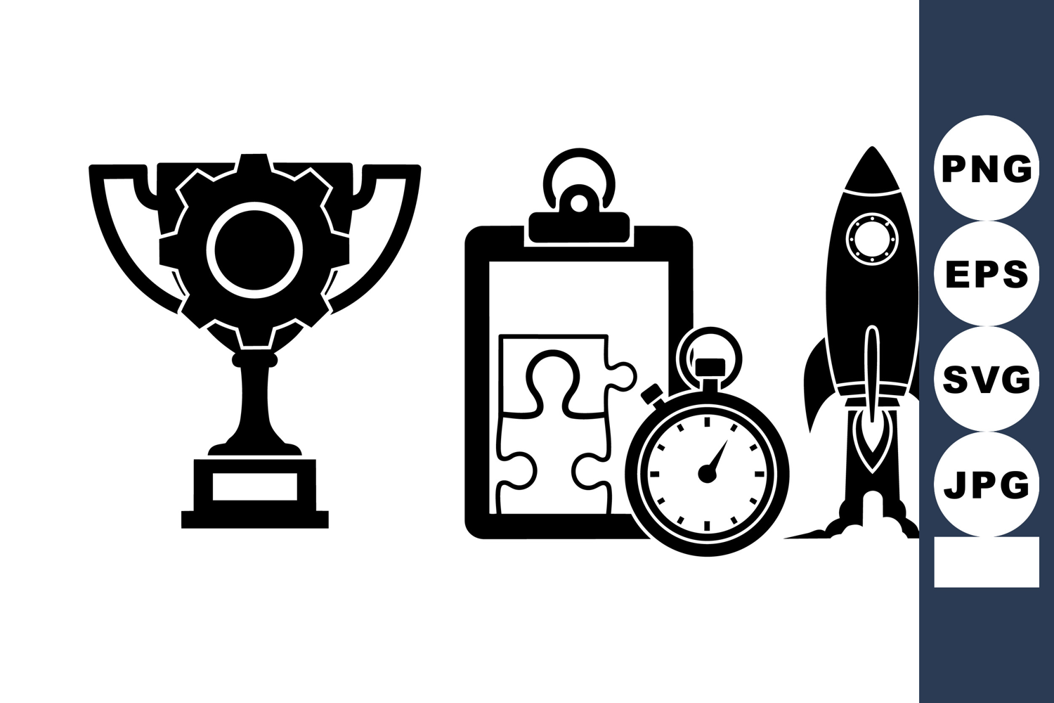 A collection of black silhouette vector icons including trophy with gear, puzzle clipboard, stopwatch, and rocket representing success and startup growth concepts.