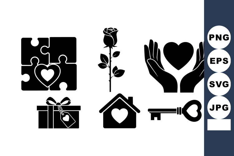 A set of six black silhouette icons including puzzle pieces with heart, rose flower, hands holding heart, gift box with tag, house with heart, and heart shaped key in flat vector style.