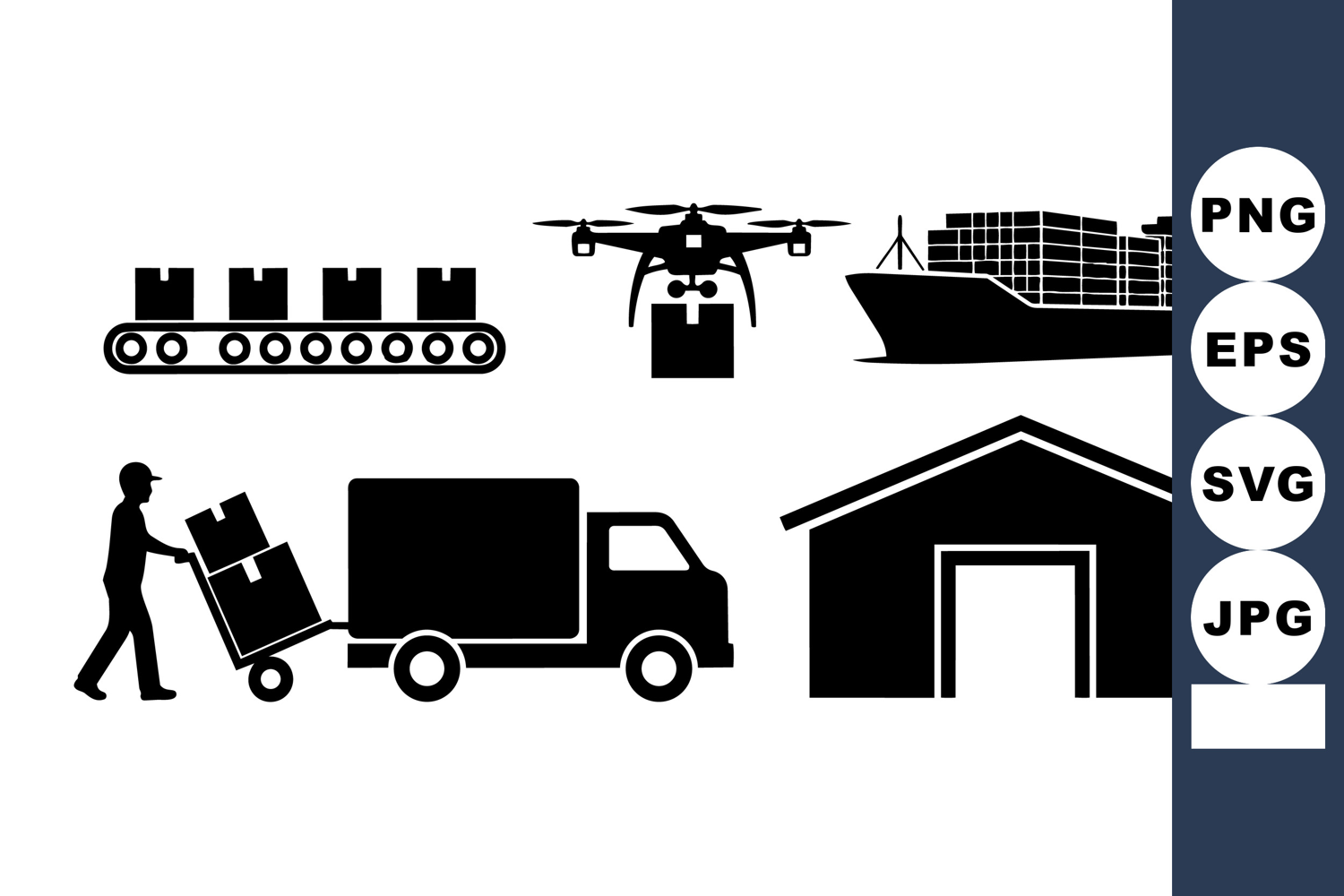 Transport Clipart Bundle Logistics Icon Set Shipping Vector Icons Freight Cargo Graphics Warehouse Storage Illustration Drone Delivery Icon Package Handling Design Truck Transport Set Container Ship Clipart Distribution Logistics Vector