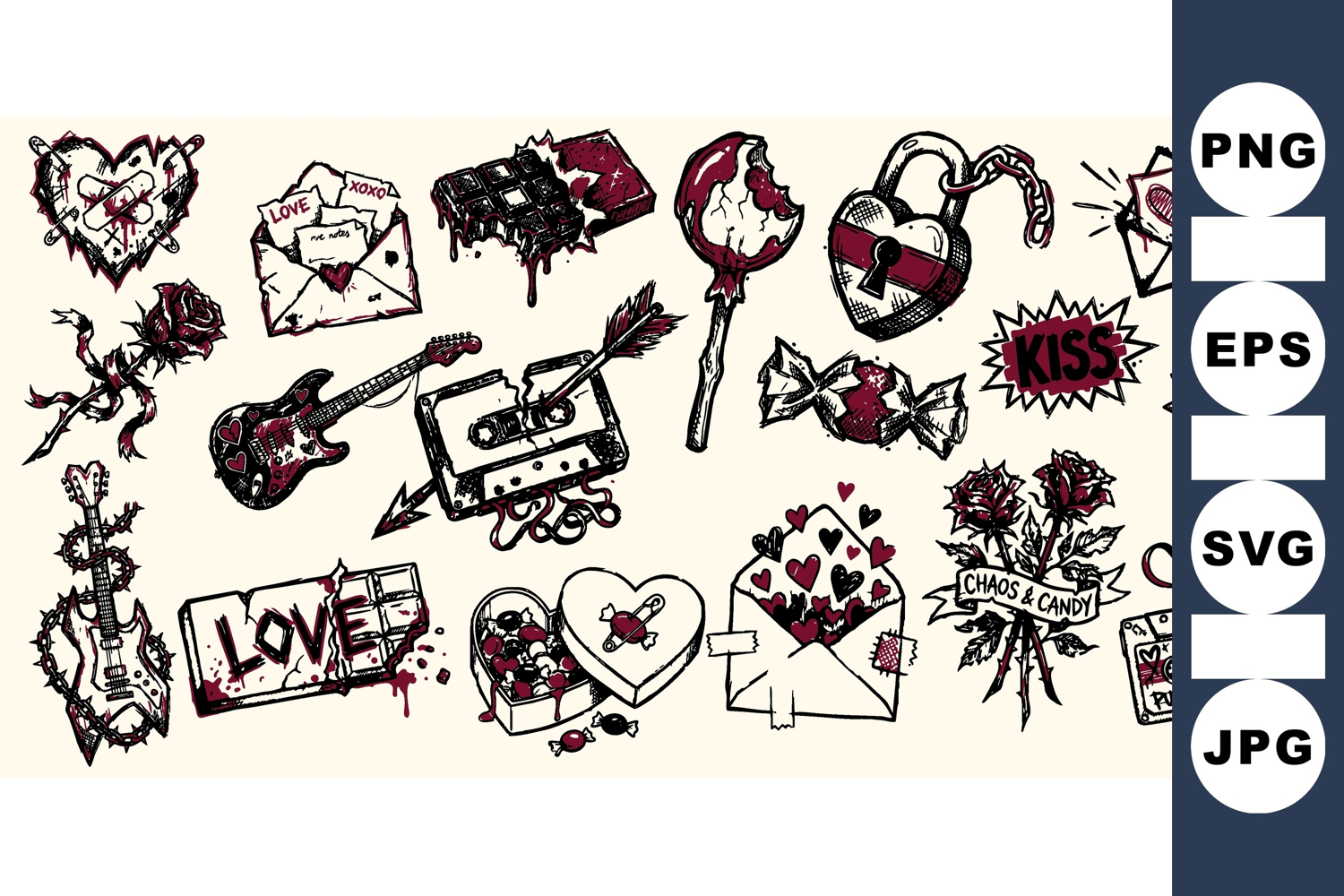 Hand Drawn Hearts Retro Cassette Clipart Valentine Punk Clipart Rock Music Graphics Love Themed Bundle Grunge Style Set Sketchy Rose Illustrations Candy And Chocolate Punk Romance Art Romantic Rock Elements