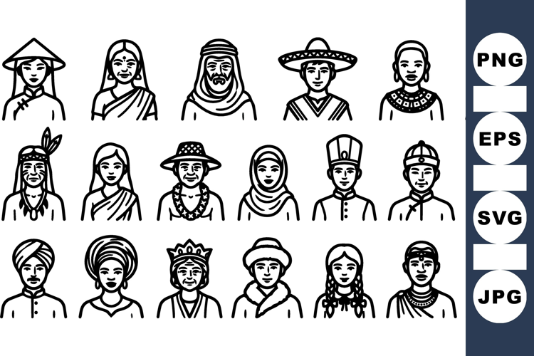 Cultural People Icons Ethnic Character Vector Traditional Costume Set Folk Portrait Illustrations Diverse Culture Icons Line Art People Set Svg Vector Faces Headshot Vector Pack Folk Dress Clipart Traditional Hat Icons