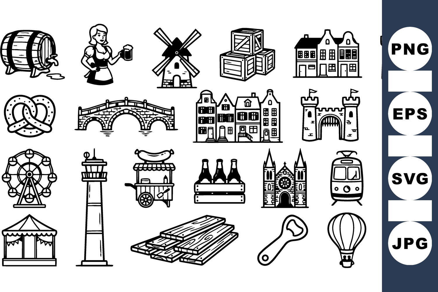 Line art icon set depicts festival and european city objects, useful for branding, signage, and print materials; playful illustrative mood