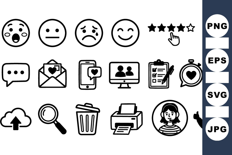 A hand drawn line art icon set displays emotive emojis, messages, ratings and ui symbols for web, app and print, playful.