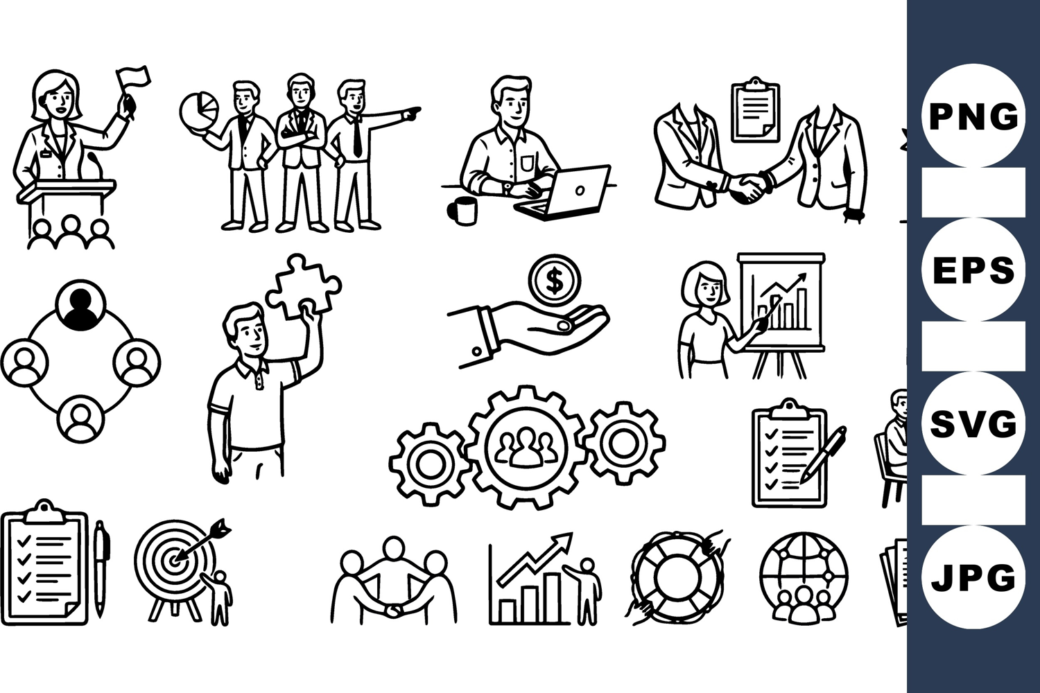 Set displays business and teamwork icons in minimalist line art style for presentations, websites and branding, crisp professional