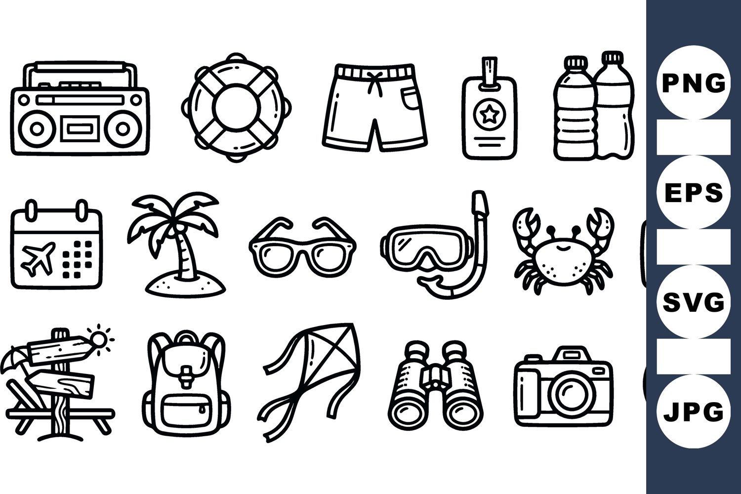 Hand Drawn Icons Summer Fun Illustrations Beach Holiday Clipart Summer Vacation Icons Beach And Ocean Clipart Travel Adventure Graphics Vacation Vector Set Holiday Travel Pack Summer Activity Designs Snorkeling And Camera