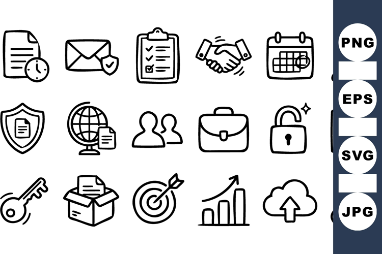 A hand drawn line art icon set displays twenty business and office symbols for web and print, playful.