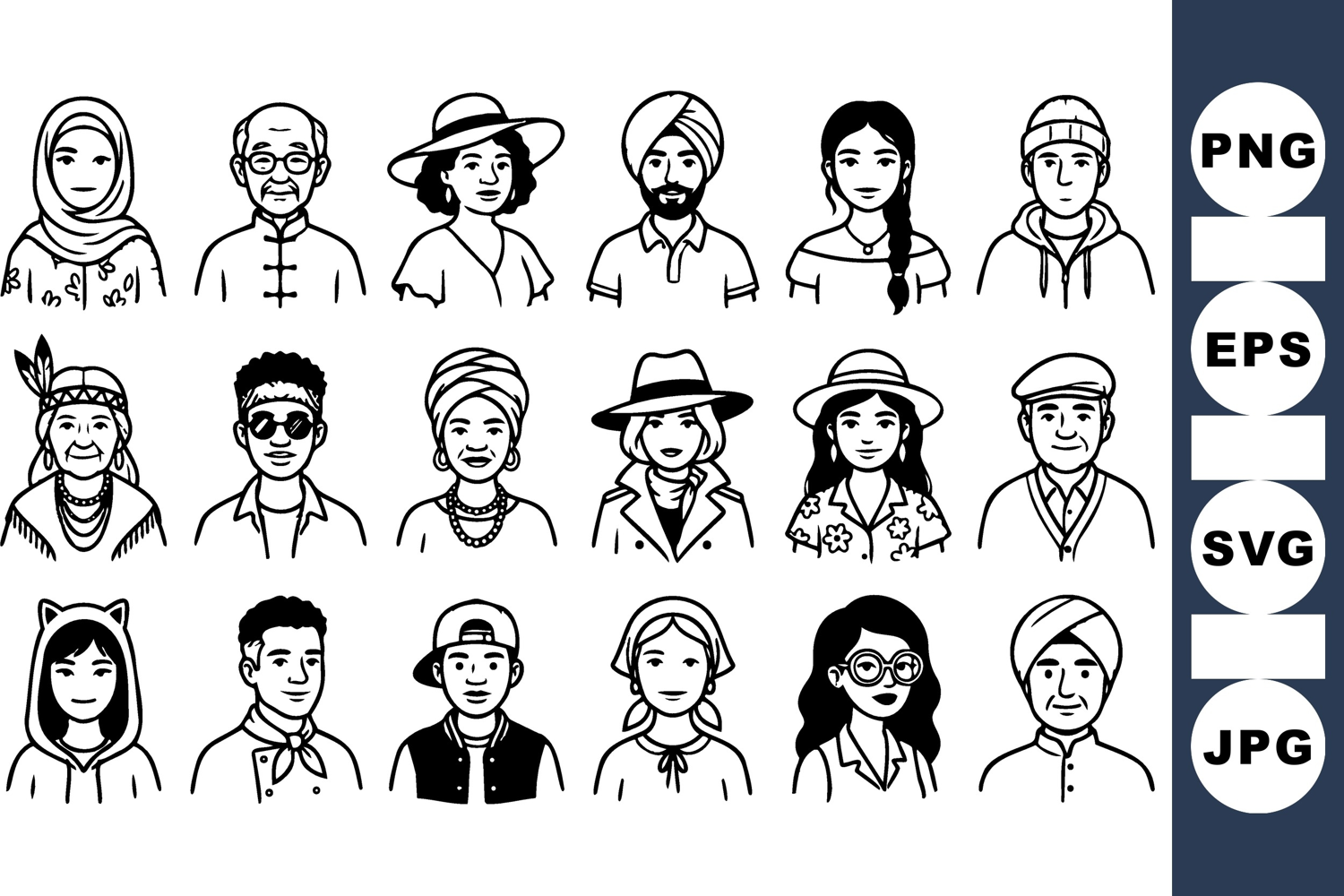 A line art avatar set displays front facing multicultural headshots with varied hats, hijab, turbans and glasses, suitable for profiles and ui, friendly.