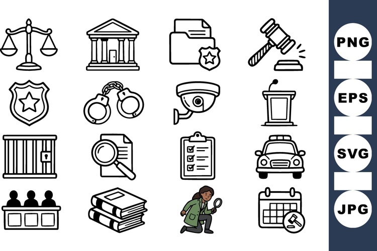 Law Enforcement Icons Legal Icon Set Judicial System Graphics Justice Icon Bundle Courtroom Icon Pack Police And Crime Icons Lawyer And Judge Icons Court Procedure Icons Investigation Icon Set Security And Evidence Icons