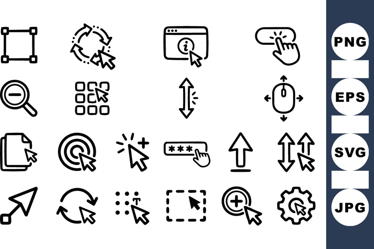A minimalist line icon set displays cursor, click, drag and ui controls for web and app design, clean functional.