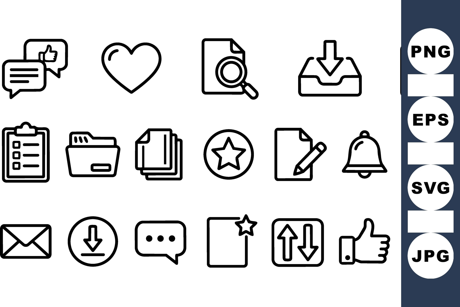 A minimalist line art icon set displays common ui symbols for messaging, files, notifications and reactions, suited for web and app design, clean.