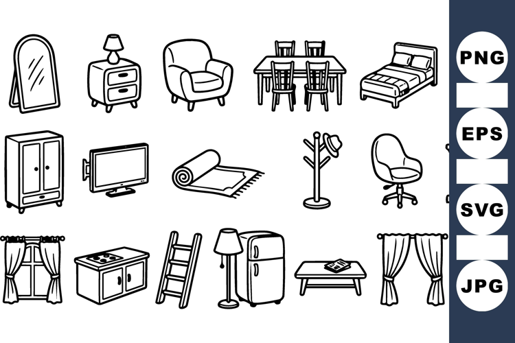 A hand drawn line art icon set depicts common furniture pieces for app ui, catalogs, and printable stickers, minimalist.