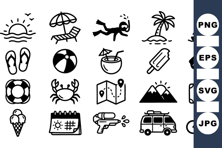 A hand drawn line art icon set depicts playful summer travel symbols for web and print usage, evoking minimal monochrome seaside vibe.