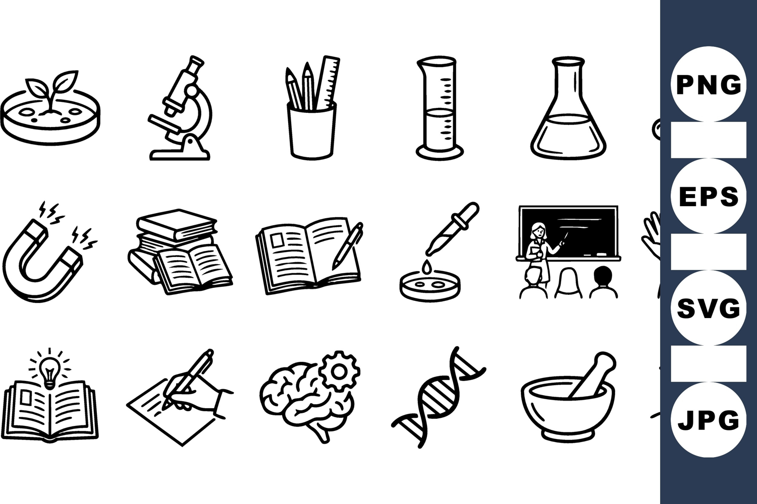 A hand drawn line art icon set depicts laboratory tools, books, teacher, dna and graduation elements for educational branding, editorial, informative.