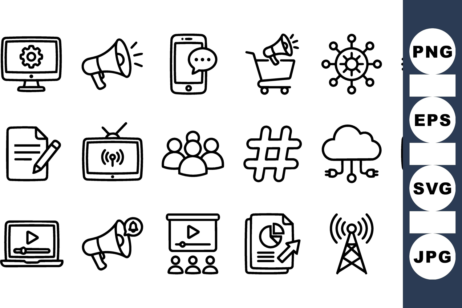 Social Media Icons Digital Communication Icons Technology Icon Set Minimal Outline Icons Online Network Graphics Broadcast And Media Icons Computer And Smartphone Icons Cloud Connection Graphics Marketing And Presentation Icons Vector Technology Bundle