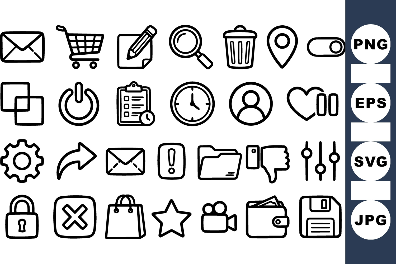 A hand drawn line icon set presents ui glyphs for web and app design, used in mockups and editorial, playful.