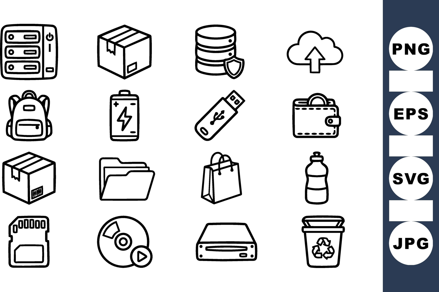 Playful hand drawn line art icon set shows storage, commerce and technology symbols for web, app and editorial use, minimalist.