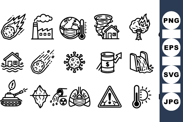 Natural Disaster Icons Hazard Warning Symbols Disaster Risk Icons Emergency Safety Graphics Environment Hazard Set Industrial Risk Icons Climate Change Graphics Pandemic Safety Symbols War And Attack Icons Fire And Flood Alerts
