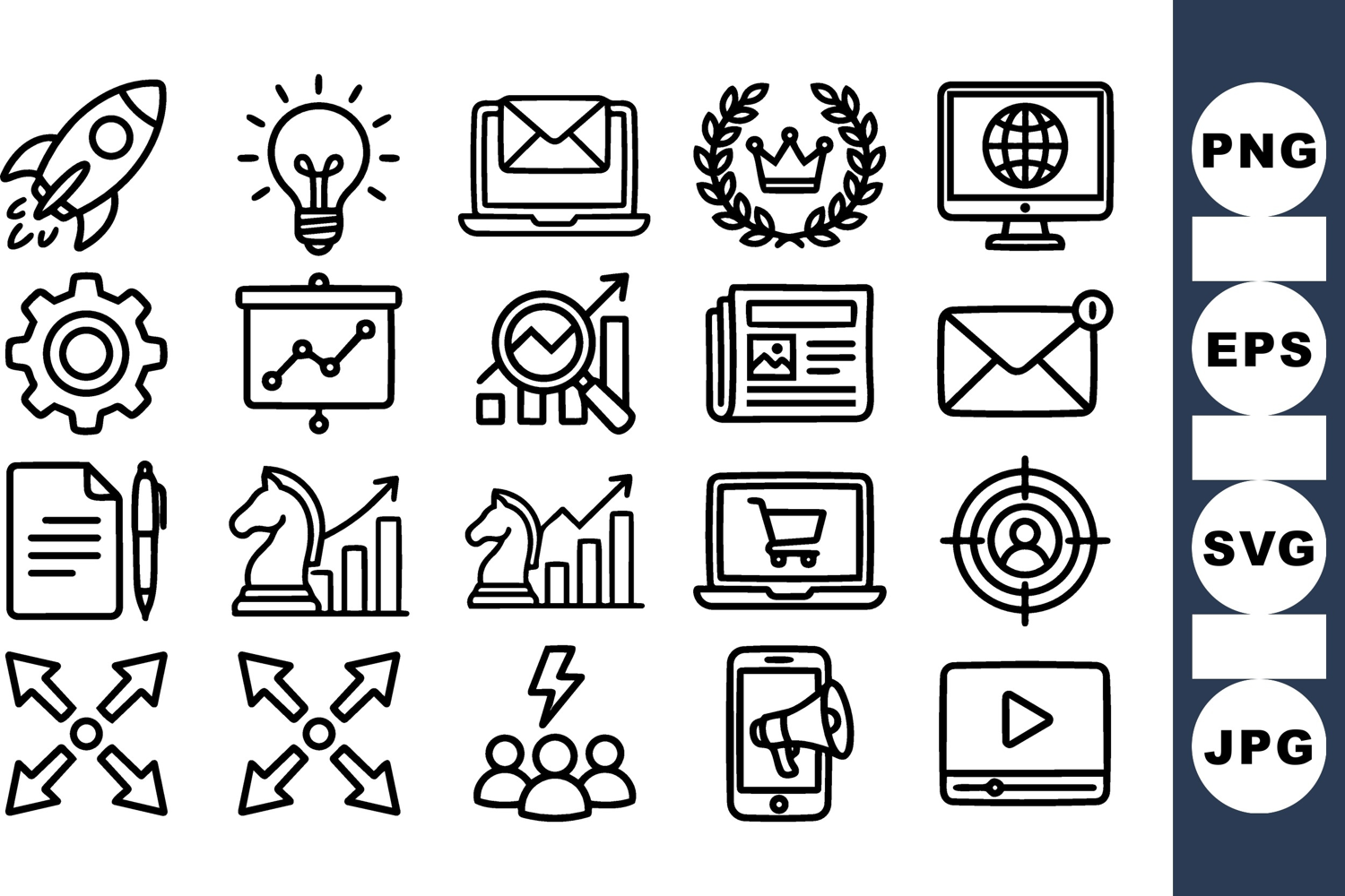 Outline icon set displays business and marketing symbols in a monochrome grid for app, web and branding usage, minimalist.
