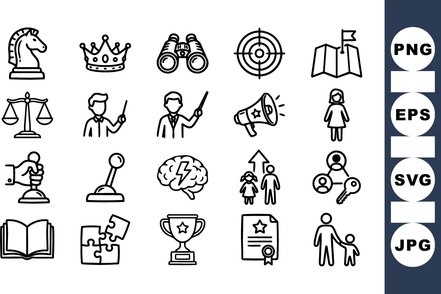A clean line art icon collection displays educational, leadership and growth symbols for web, app and print use, minimal and versatile.