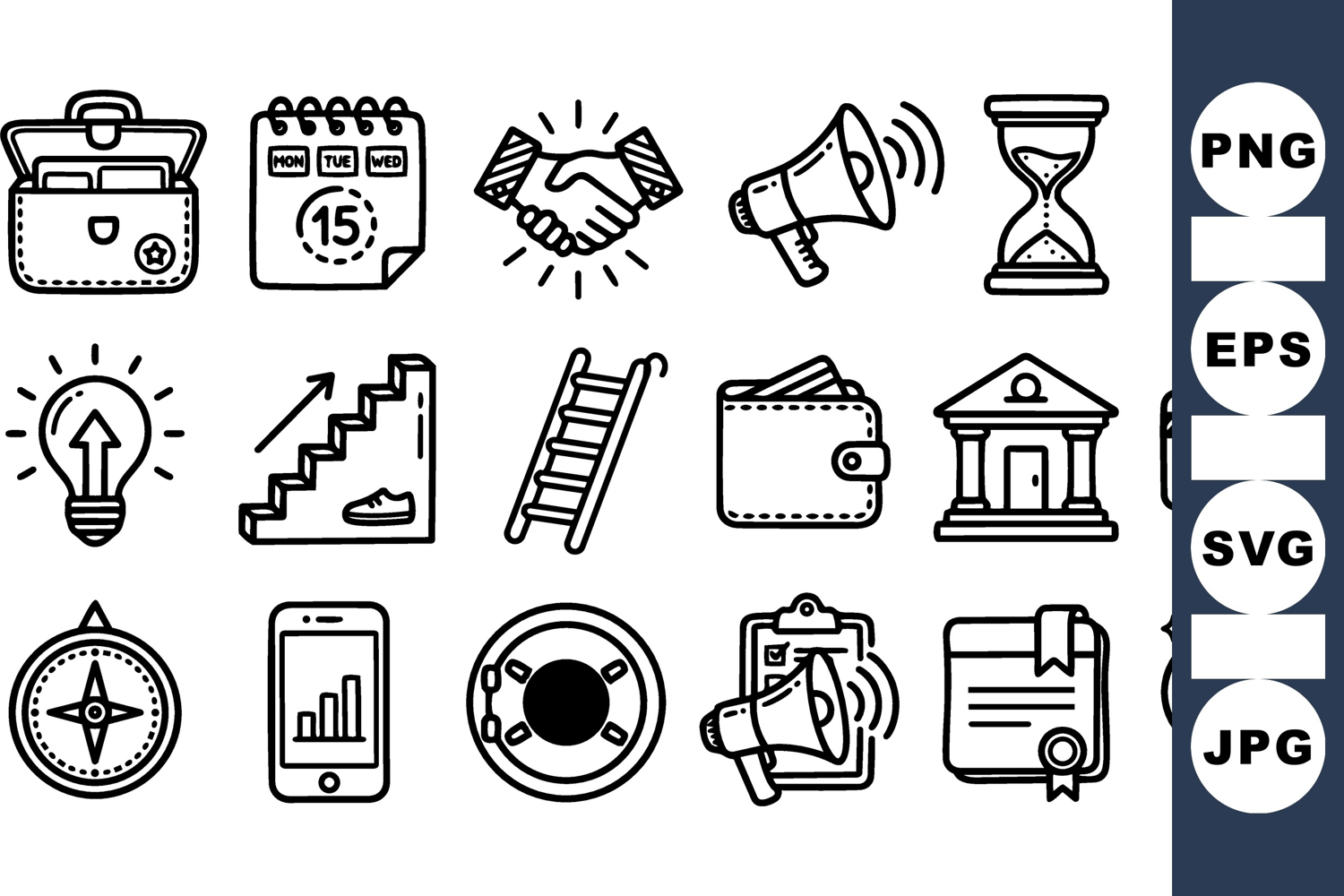 A hand drawn icon set depicts business and finance symbols in clean line art for ui, branding, and print use professional