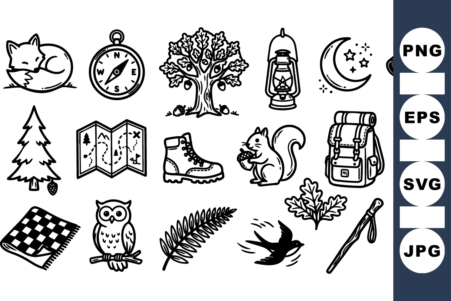 Forest Animal Clipart Hand Drawn Camping Black White Icons Nature Trail Graphics Outdoor Adventure Icons Campfire Illustration Set Hiking Gear Bundle Woodland Element Pack Exploration Design Set Travel Accessory Clipart