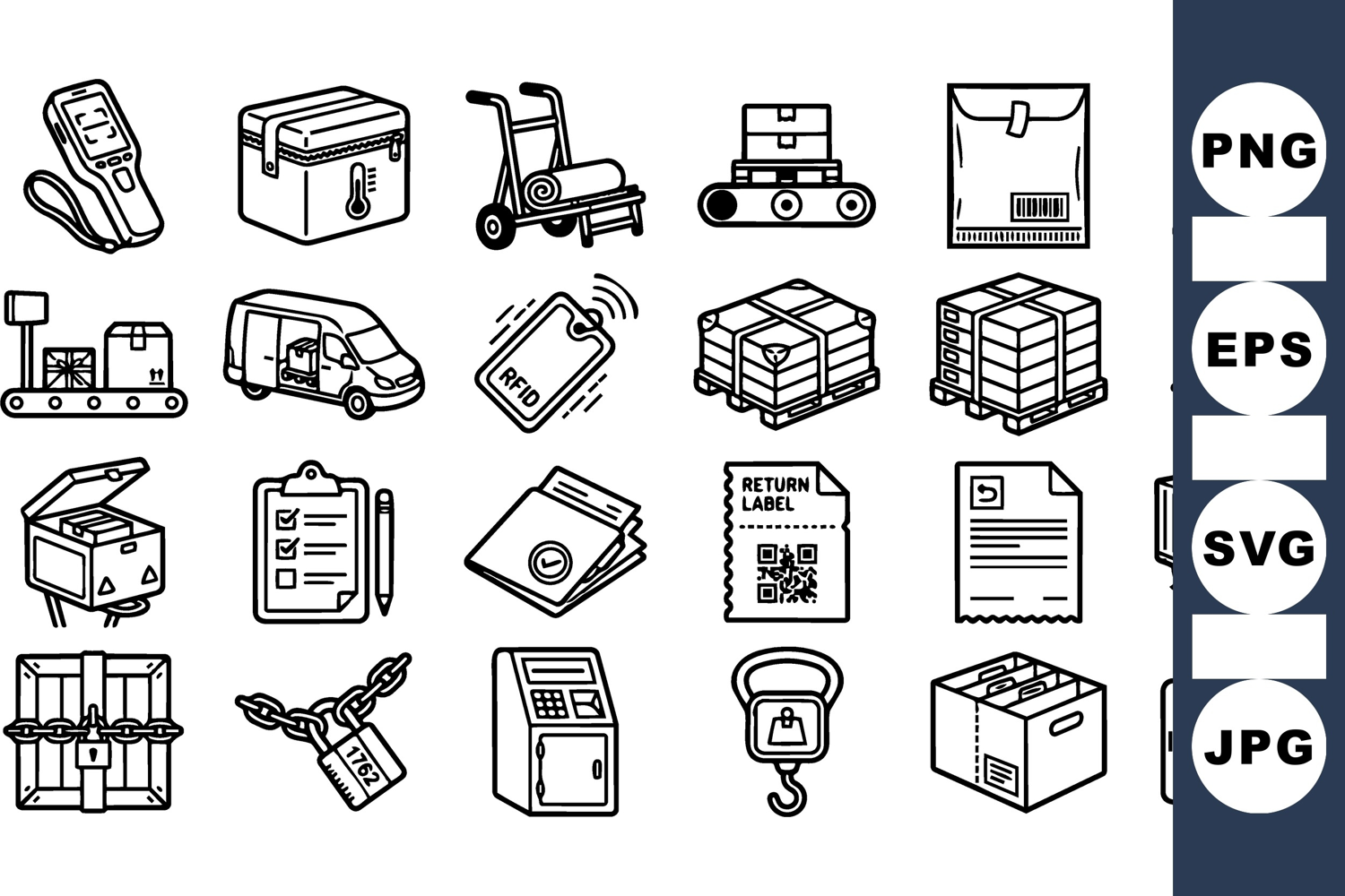 Security Lock Icons Logistics Icon Set Shipping Icon Pack Warehouse Management Icons Package Delivery Icons Cargo Transport Icons Parcel Tracking Graphics Freight Shipping Symbols Cold Storage Icons Return Label Graphics