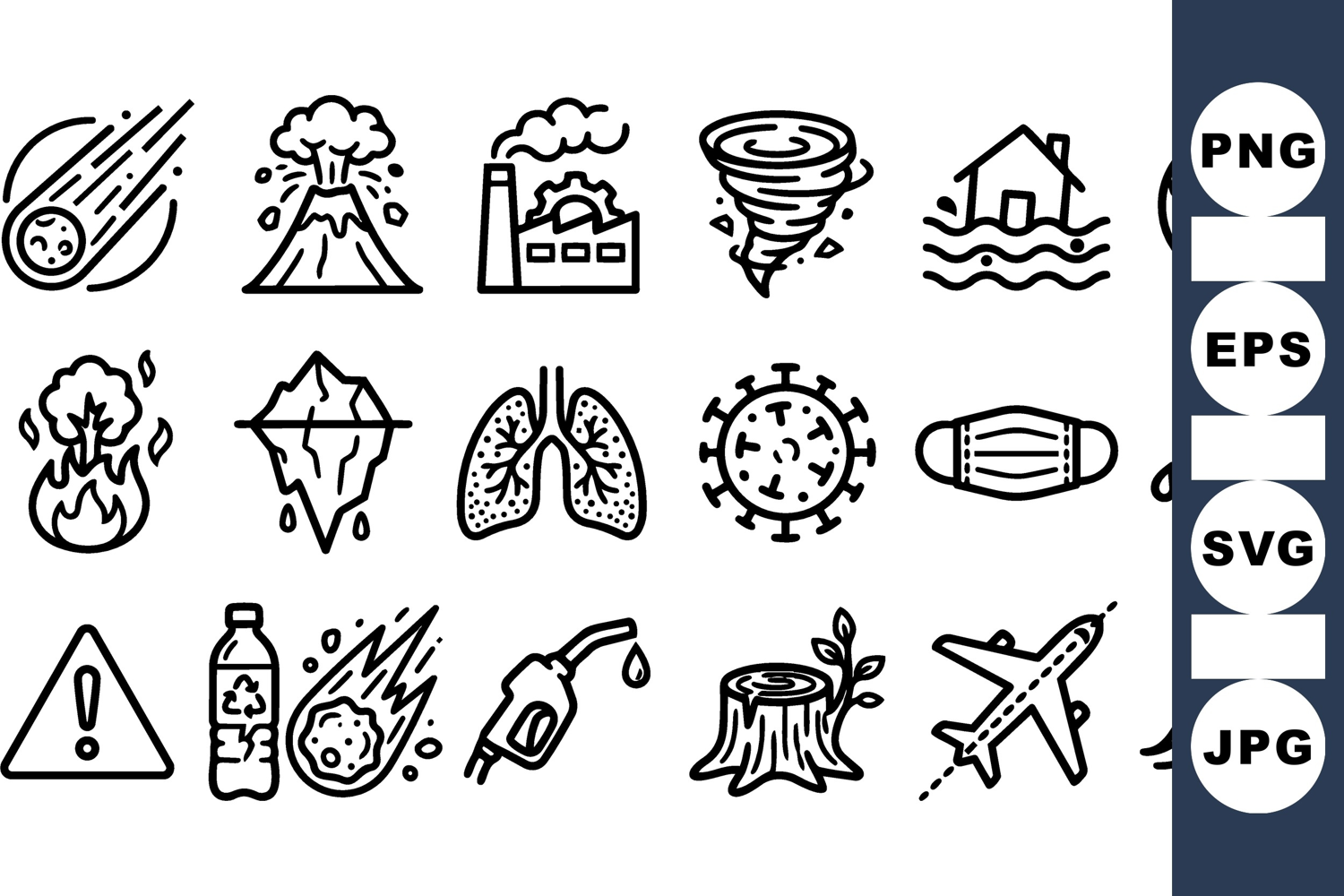 Natural Disaster Icons Virus Protection Icons Environmental Hazard Pack Emergency Warning Symbols Pollution Problem Graphics Wildfire Smoke Illustrations Climate Change Set Earthquake Damage Symbols Flood Water Icons Oil Spill Graphics