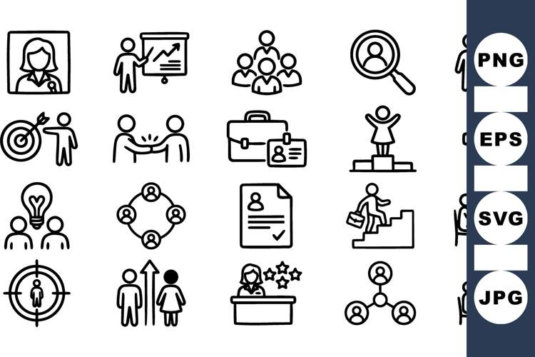 A minimal line art icon collection depicts hr, recruitment, teamwork and growth symbols for web, app, and presentation use, clean.