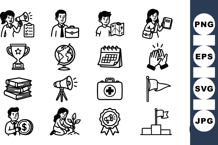 Line art icon set displays business, education, and community symbols in a neat grid for web, app, and presentation use, minimal.