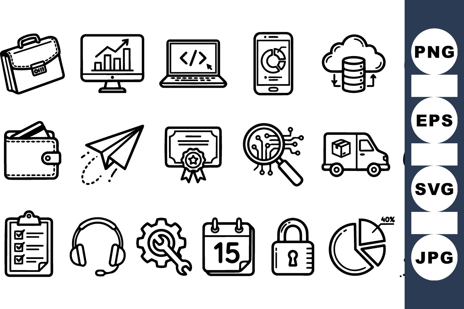 A line art icon set displays business, finance and tech symbols for web, app and print interfaces, clean and minimal.