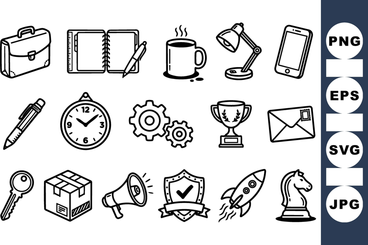A hand drawn line art icon set depicts office and business objects for web or print use, crisp minimalist.