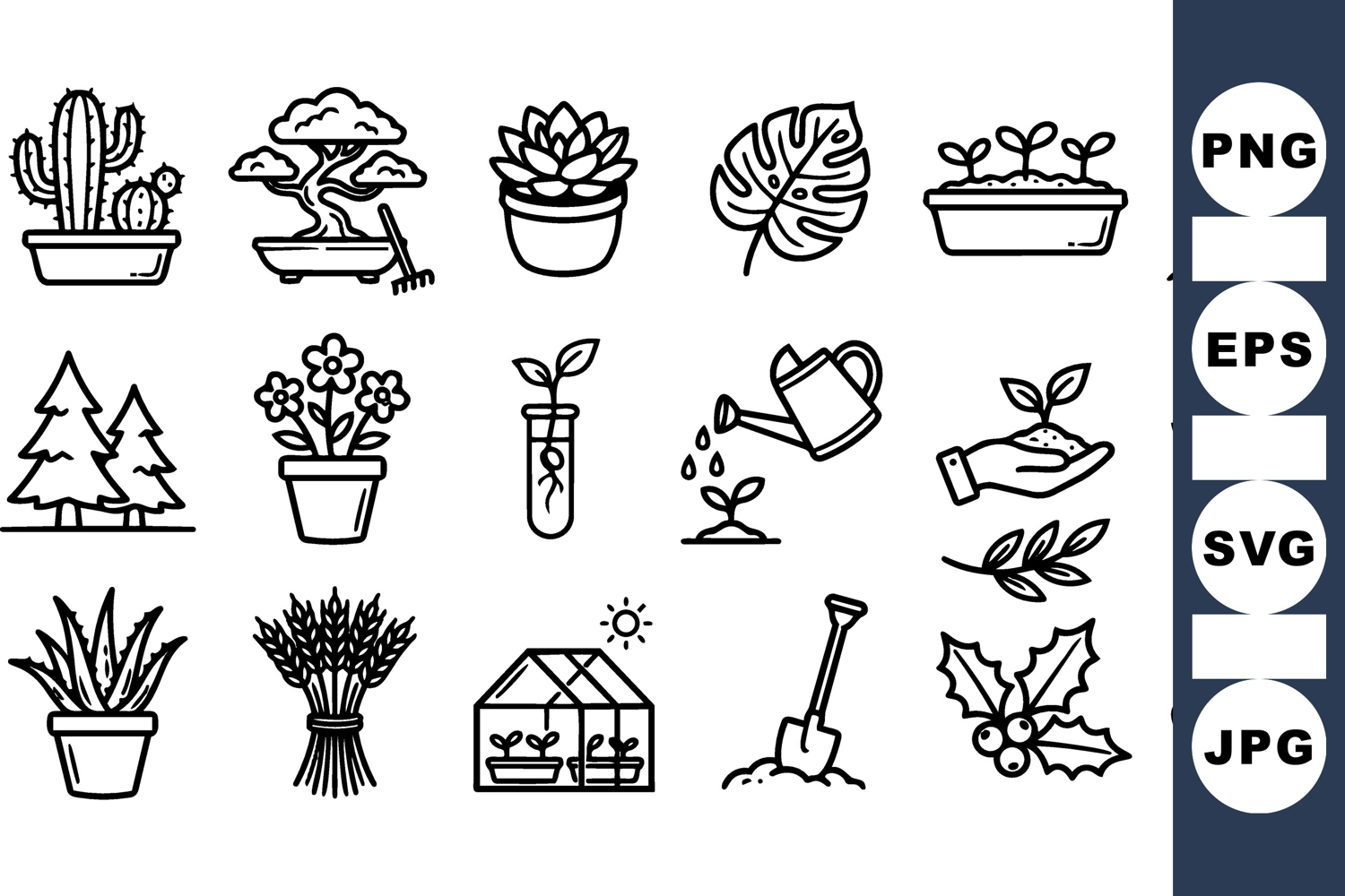 A clean hand drawn line art icon set depicting gardening and houseplants, suited for web icons, labels, and print, minimalist.