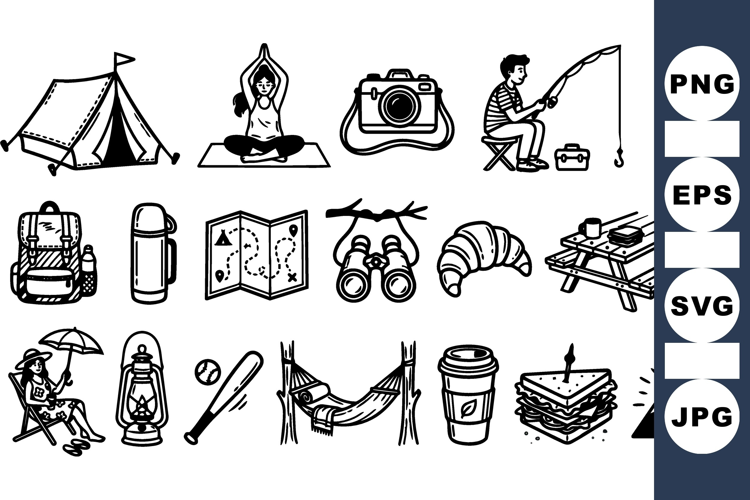 Camping Icon Set Nature Camping Bundle Summer Vacation Icons Campfire And Tent Hiking Equipment Set Outdoor Adventure Vector Recreation Gear Clipart Fishing Activity Pack Travel Exploration Kit Picnic And Grill