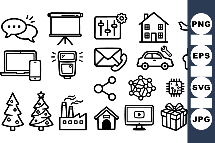 Social Media Graphics Business Icon Set Communication Symbol Pack Technology Device Icons Office Tool Illustrations Holiday Tree Icons Video Play Symbols Home And Car Icons Email Phone Graphics Factory Building Vector