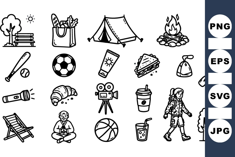 A hand drawn line art icon collection depicts camping, picnic, sports and leisure objects for social media and print, playful.