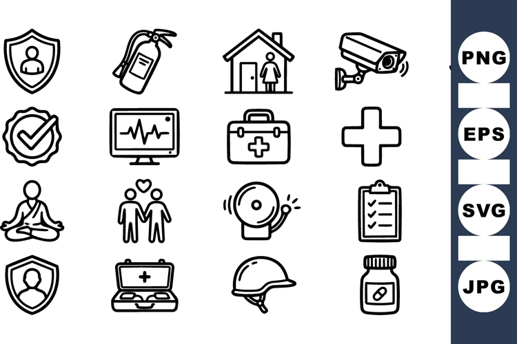 A line art vector icon set depicts medical, safety and wellness symbols arranged in a clean grid for ui and print, minimal.