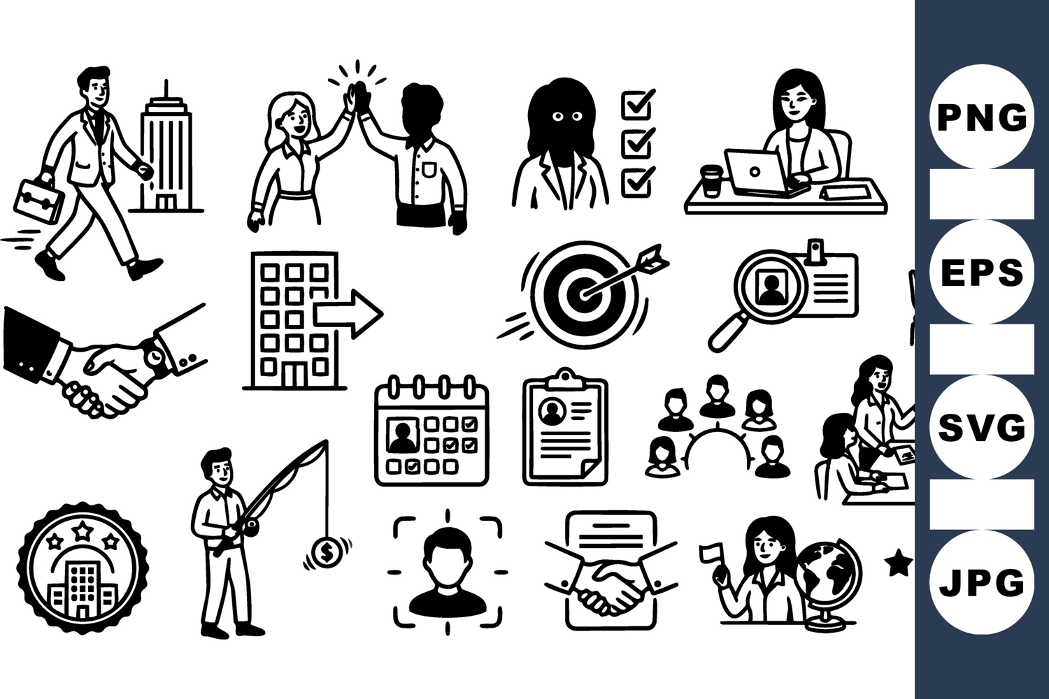 A monochrome vector icon collection depicts business concepts like meetings, hiring, targets and ratings for web, apps, presentations, professional.