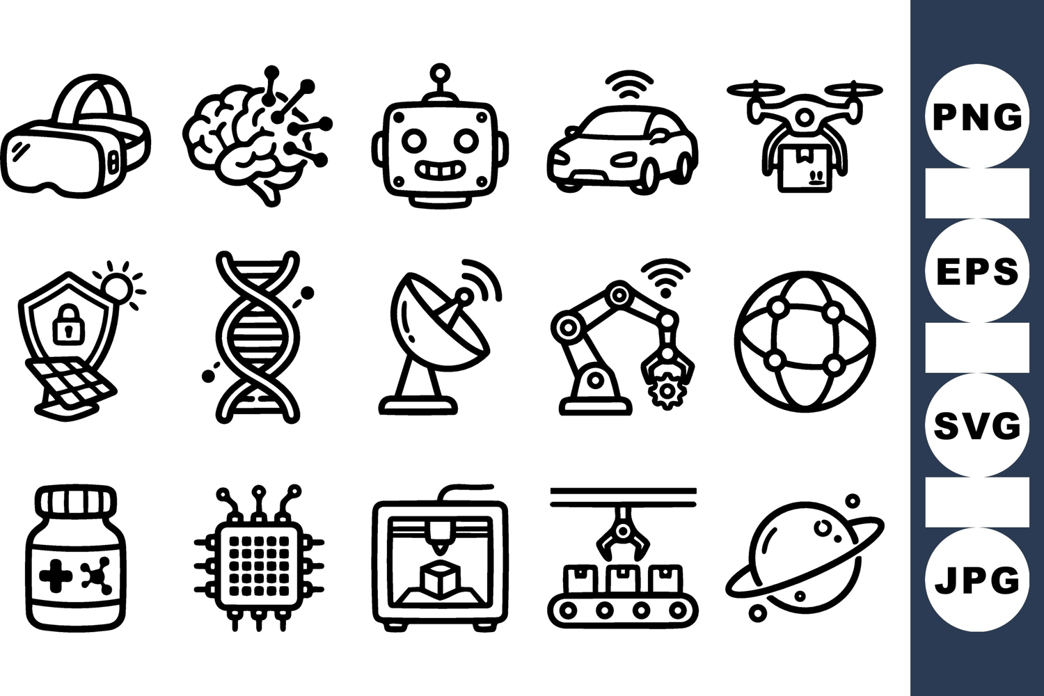 Virtual Reality Headset Space Exploration Icons Tech Icon Set Robotic Arm Clipart Automation Machine Icons Artificial Intelligence Graphics Digital Network Design Dna Biotech Illustration 3d Printing Bundle Cyber Security Pack