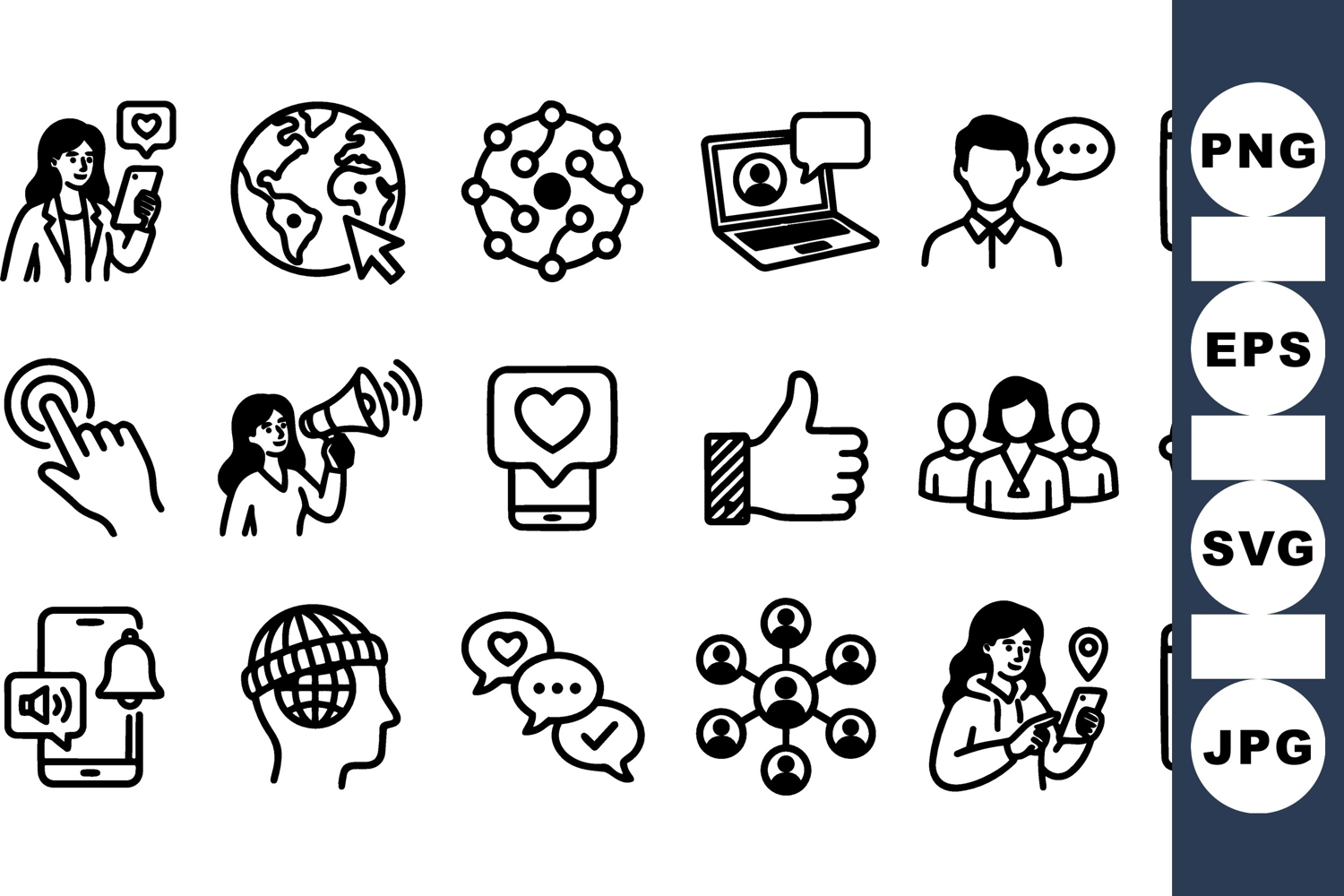 A monochrome line art icon set illustrating social media interactions and network connections, useful for web ui and marketing, clean.