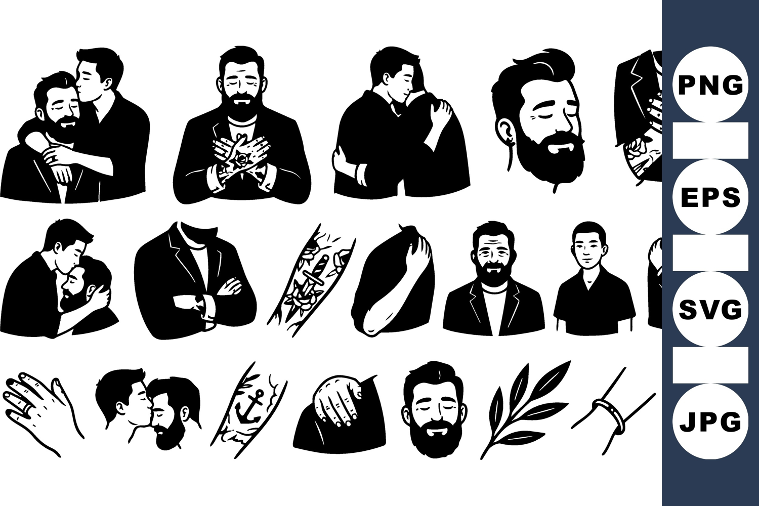 Bearded Man Clipart Black Ink Clipart Masculine Clipart Set Romantic Men Design Tattooed Men Bundle Hugging Couple Graphics Affectionate Men Art Intimate Male Illustrations Hand Drawn Male Vector Tattoo Arm Clipart